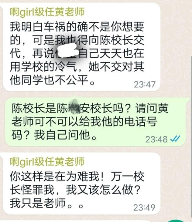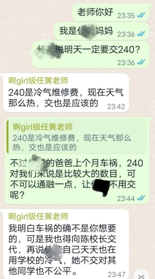 (新山24日讯)网传新山某华小强制学生家长缴付240令吉冷气维修费,就连家长以学生父亲车祸为由,要求通融,仍遭到老师拒绝。