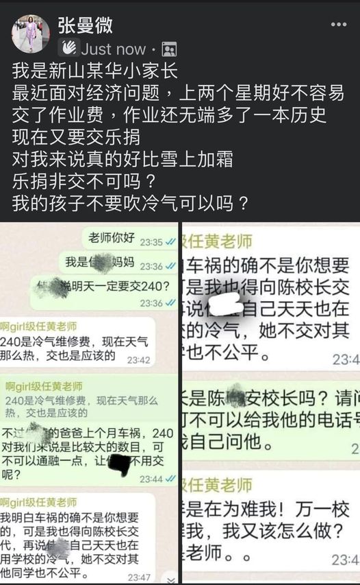 文中指出,她是来自新山某华小家长,最近面对经济问题,上两星期好不容易交了作业费,现在又要乐捐,有感雪上加霜,更指孩子可以不要吹冷气。