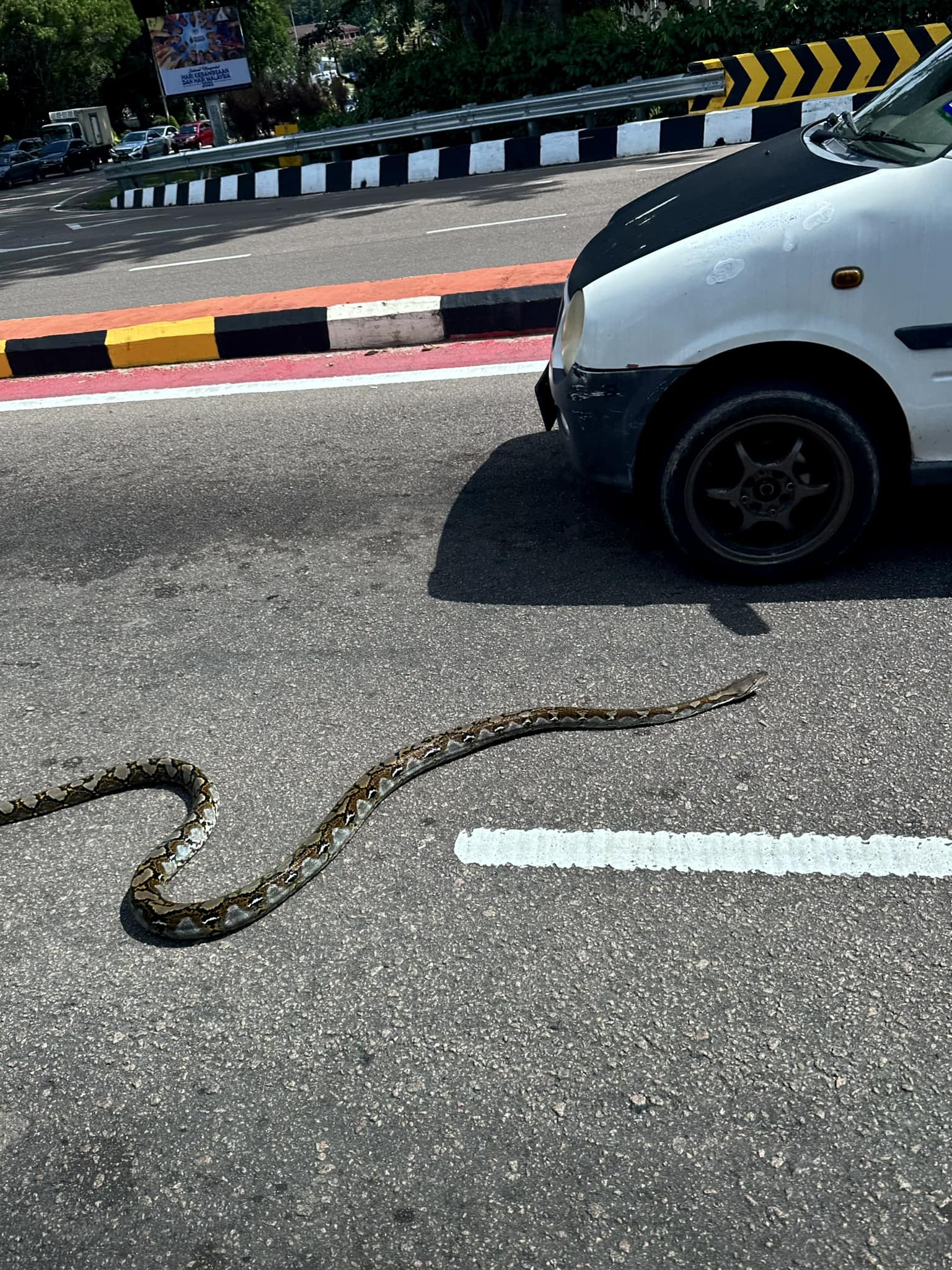 (居銮27日讯)马路如虎口,居銮人感叹,现在公路上行驶,不仅遇到大象,还得闪避蛇。