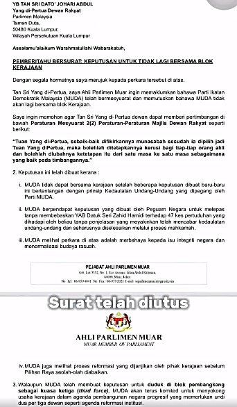 赛沙迪也是MUDA主席,他今日傍晚在社交媒体做出宣布,并指有关公函也已提交给国会下议院议长。