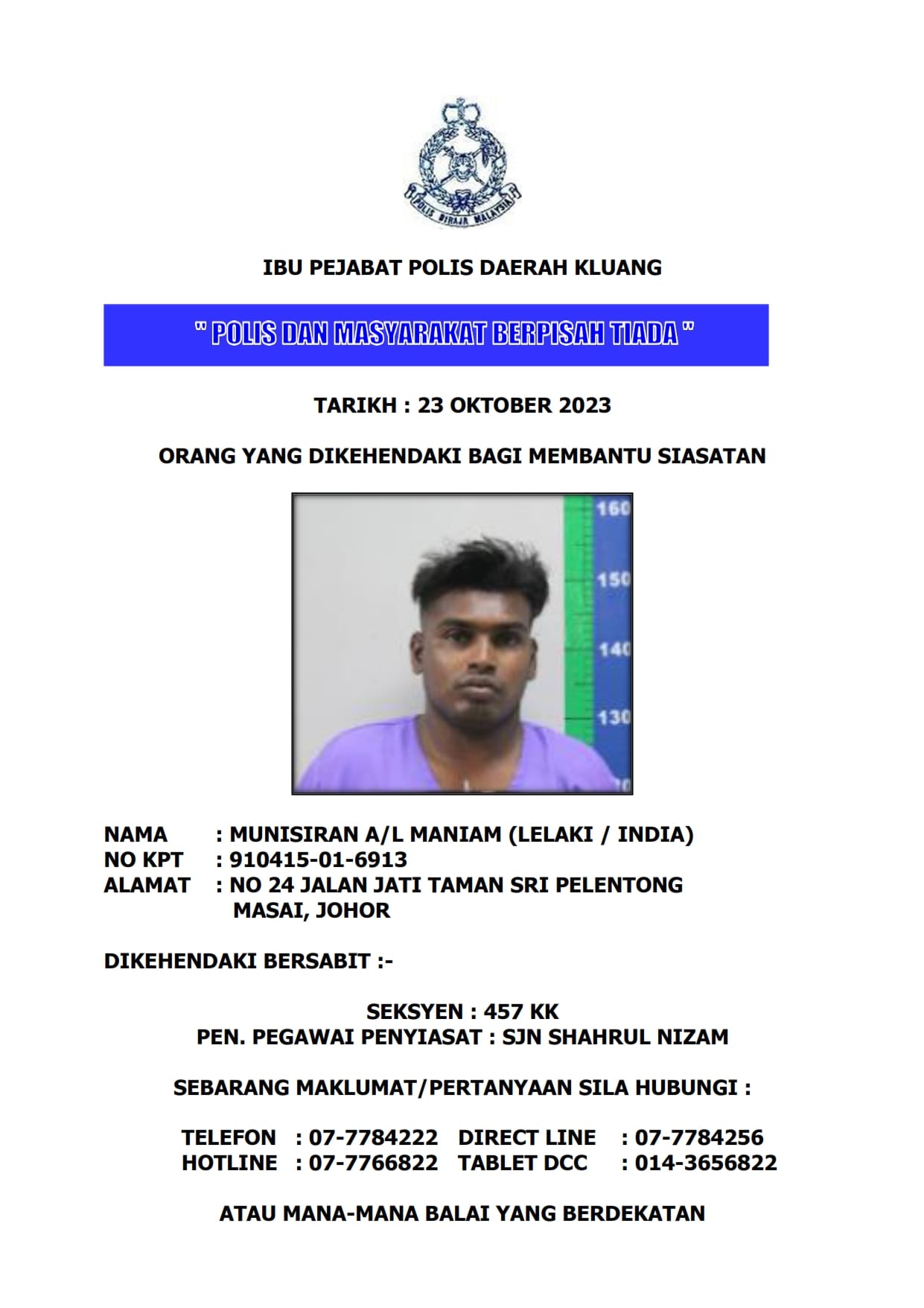 目前落网的有4人,警方尚在追缉一名在逃嫌犯 M Munisiran(32岁),最后住址位于新山避兰东(No 24 Jalan Jati Taman Sri Plentong, Masai Johor.)