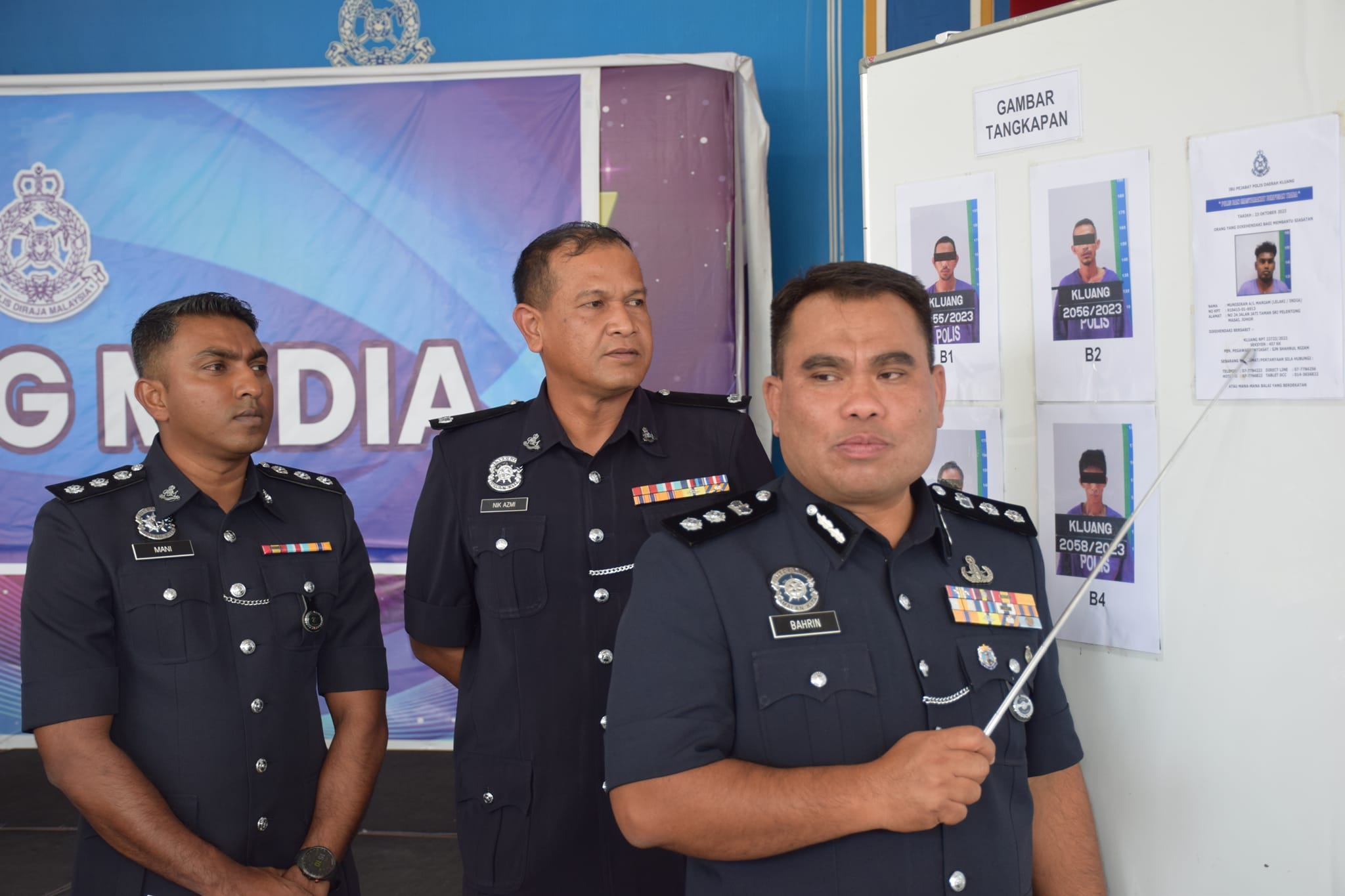 居銮警区主任巴林昨日召开记者会指出,警方于10月20日上午10时至下午3时,分别在宏愿花园(Taman Wawasan)和 Sri Lumpur甘榜逮捕了3男1女嫌犯,年龄介于24至38岁。