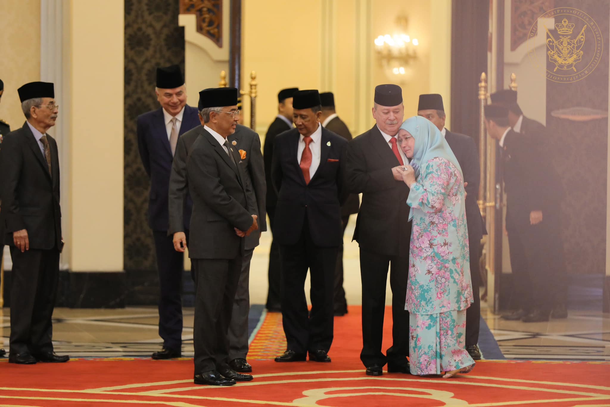 在确认哥哥苏丹依布拉欣接捧国家元首的重任,现任元首后东姑阿兹莎阿米娜陪伴在身,给予王兄拥抱,依偎在旁落泪。