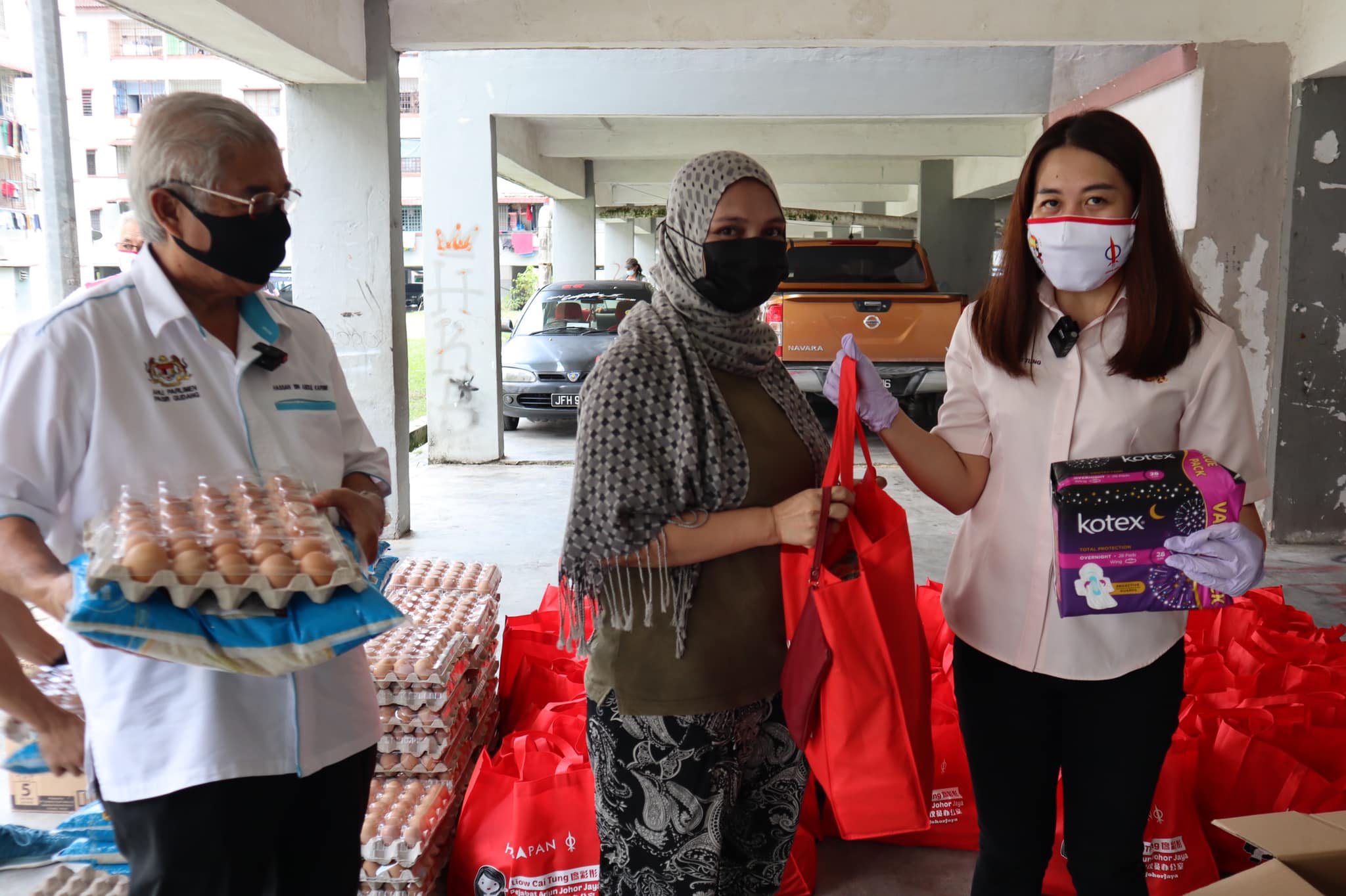 昨天,她把Michelle 捐献的物资再加上办公室的白米和其他物资一起送到至达城Tasek 64 组屋区,并指或许很多人没有想到,除了干粮、女性生理用品也是必需品之一。
