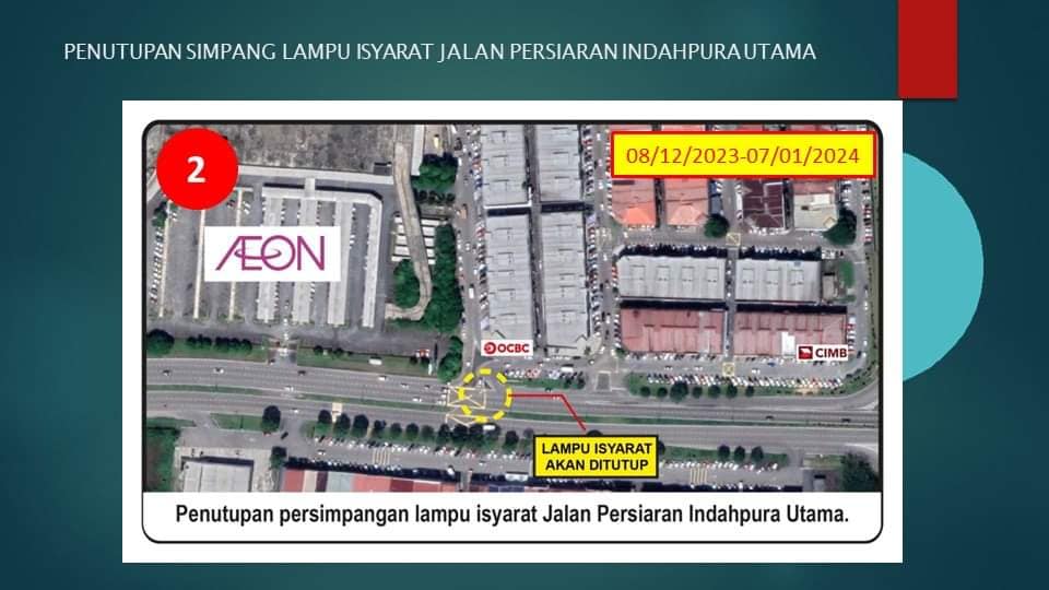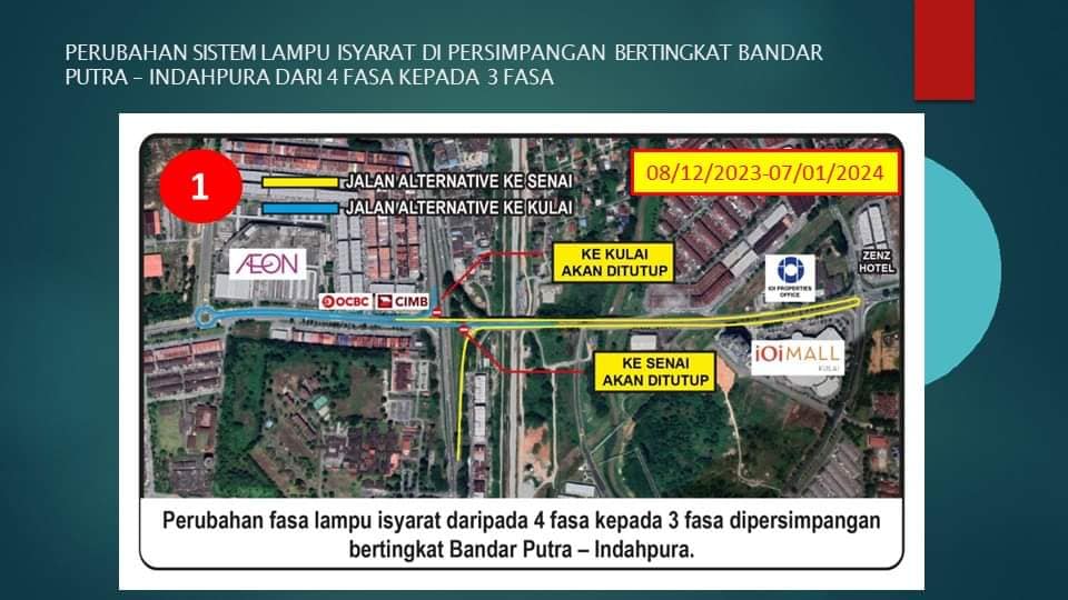 同时,从太子城往古来的路口将被关闭,而从优美城往士乃的路口也将被关闭。Ocbc Bank前的交通灯路口将被关闭。