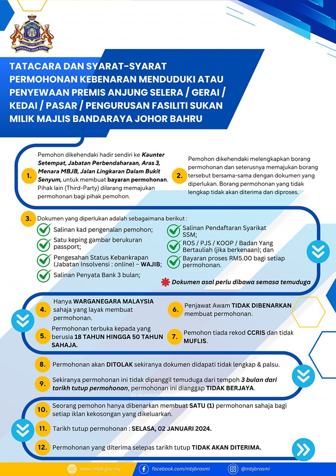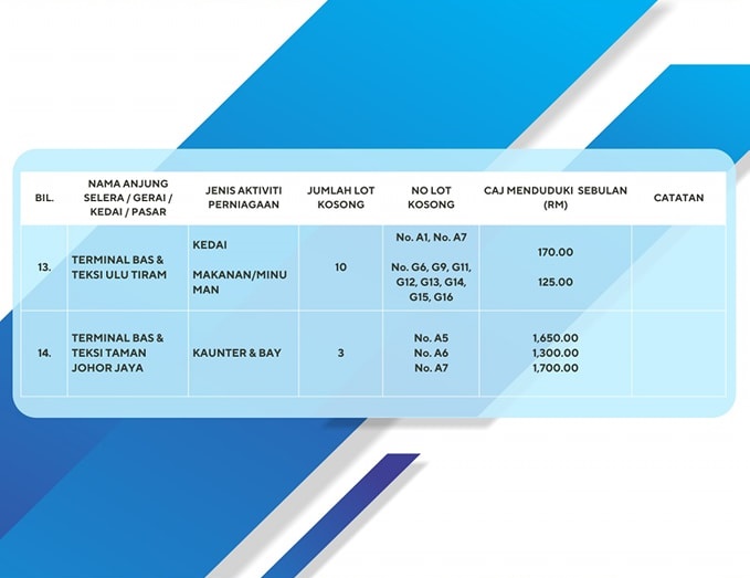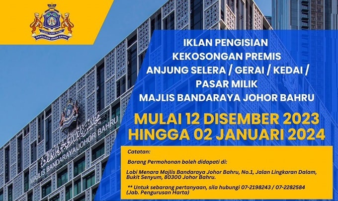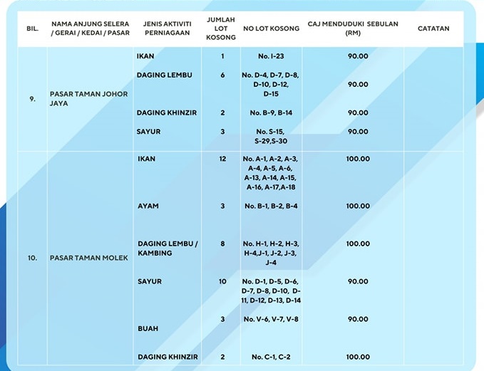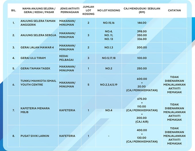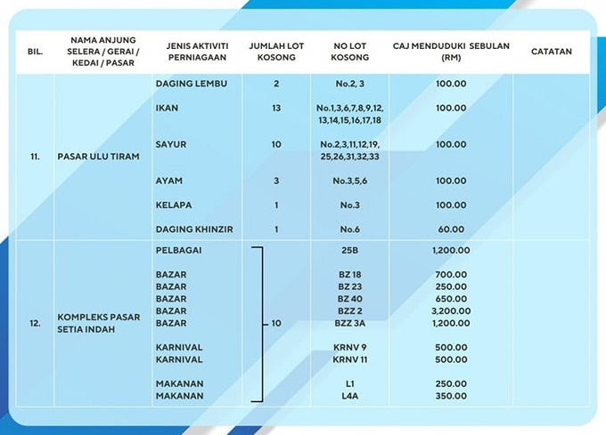 新山市政局今日发布各区空置的商铺和摊档出租,包括巴刹、市场、美食中心、食摊、青年中心、巴士站、市政局大厦等各种摊位。