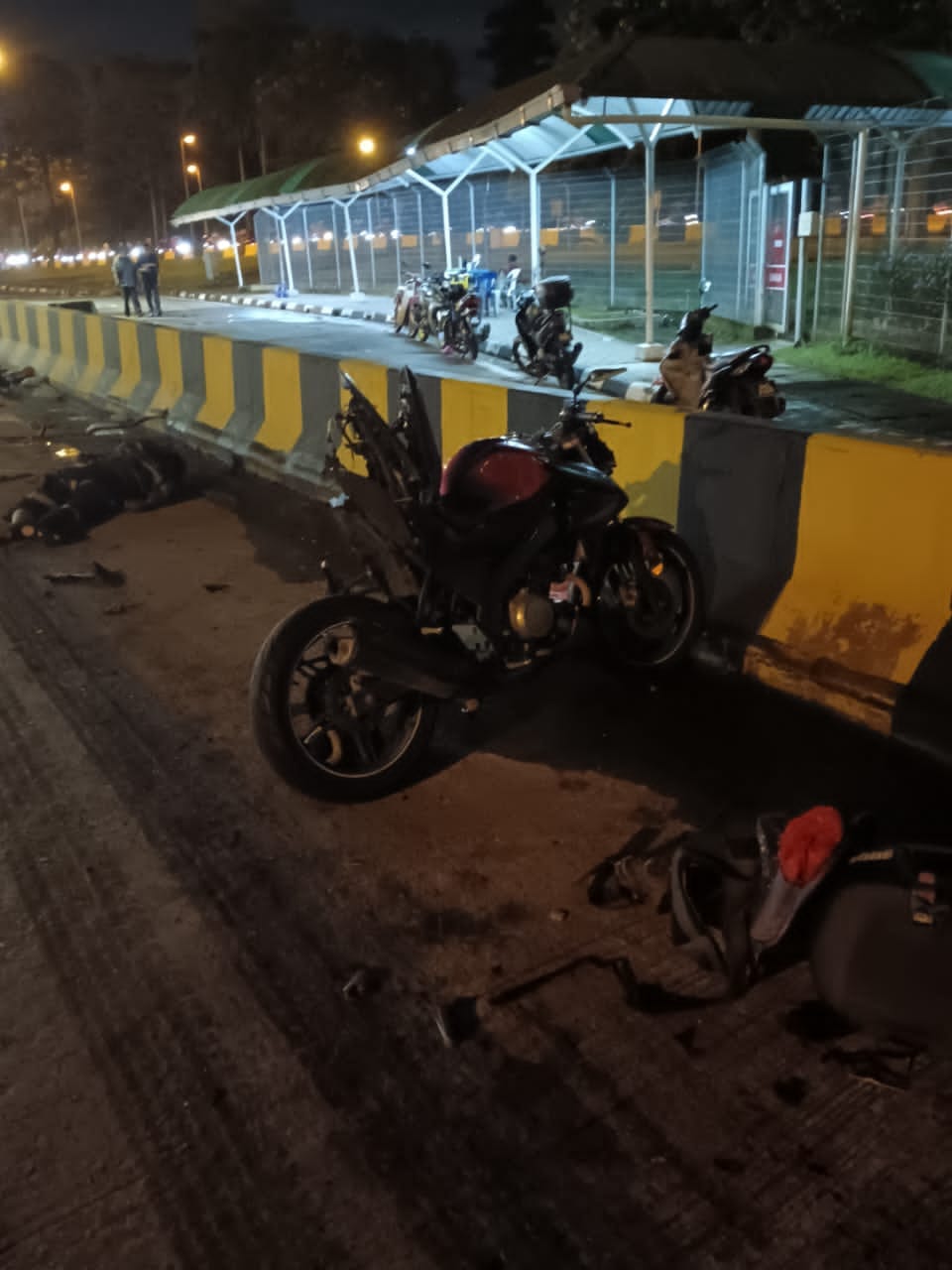 (新山22日讯)收费站恐怖车祸!一辆罗厘疑失控酿车环撞,两名相信是越堤族的骑士卡在罗厘底下,当场身亡。