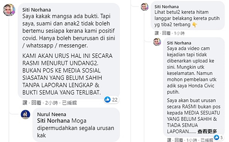 其中有网民Siti自称是涉案事主的姐姐,因确诊冠病目前隔离中,并指弟弟驾驶的白色Honda轿车是被撞及才抛飞,更称自己有事发时的视频。