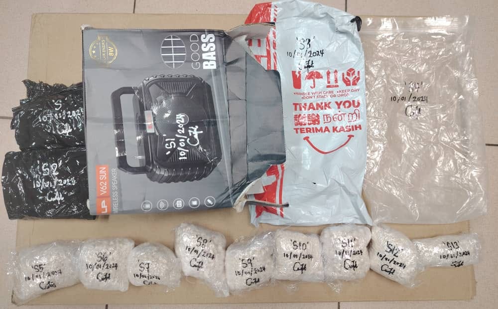 他说,警方起获了2个黑色塑料包裹、一个印有Good Bass的纸盒、1个印有易碎品字眼白色塑料袋子,还有5台手机、一辆福士伟根轿车。