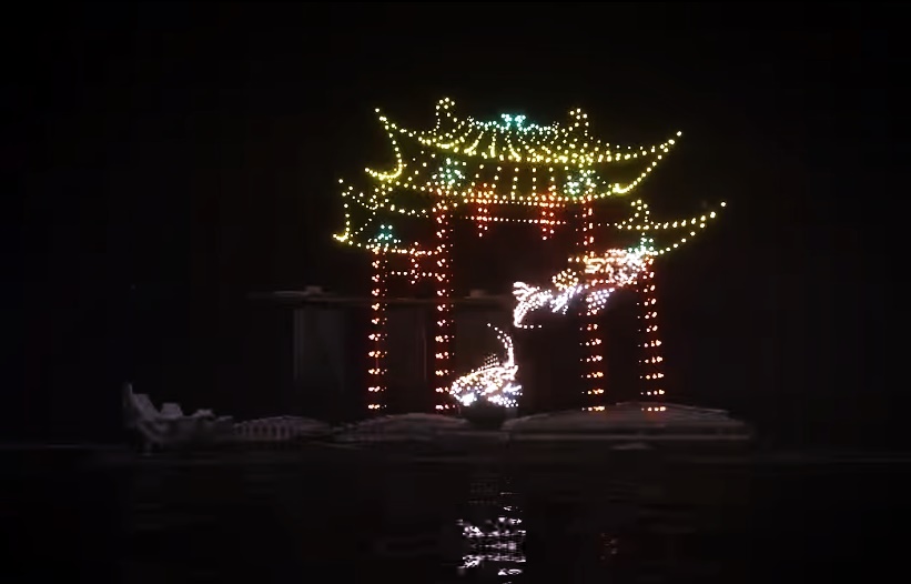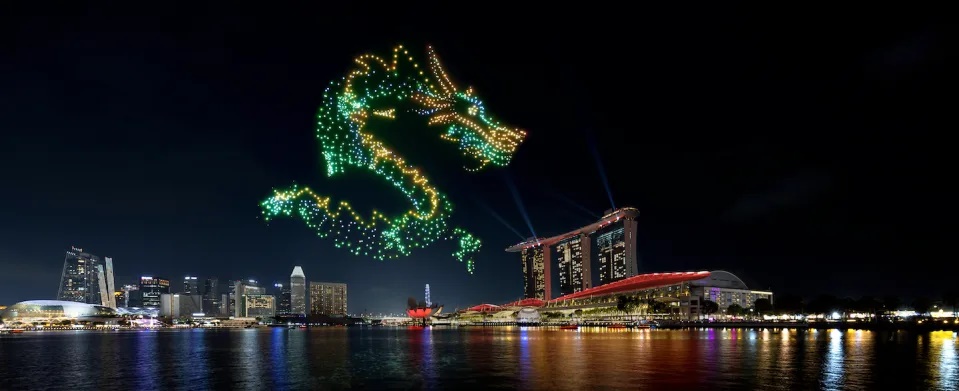 表演出动 1500 架无人机,在新加坡夜空飞行,讲述神话龙王的故事,表演中也包含“福”“旺”等具有美好寓意的图案,以迎接农历新年“龙年”的到来。
