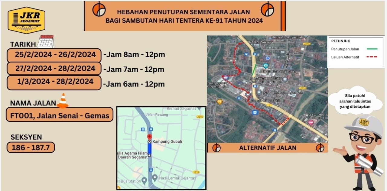 昔加末公共工程局今日发出通告,由于昔加末广场将举办陆军91周年盛典,所以周边士乃─金马士路(Jalan Senai-Gemas)的 FT001(seksyen 186.0 hingga 187.7路段,将暂时封路。