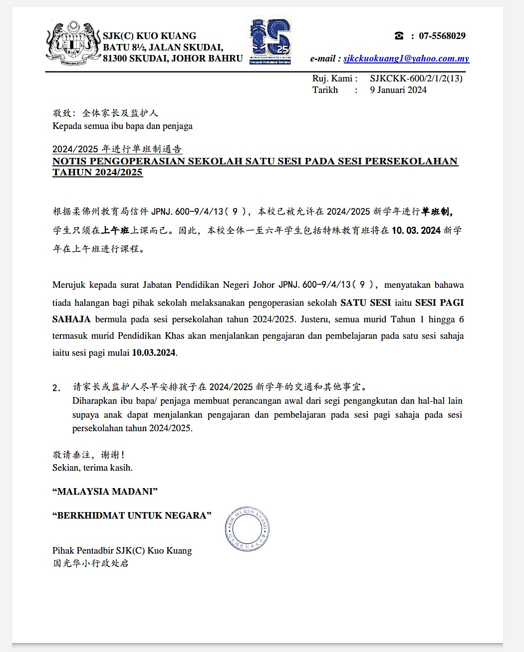校方于1月6日向家长发出通知,指国光学校(国光一校)已获柔佛教育局批准,2024年和2025年新学年,进行单班制,也就说学生一律上午班上课。