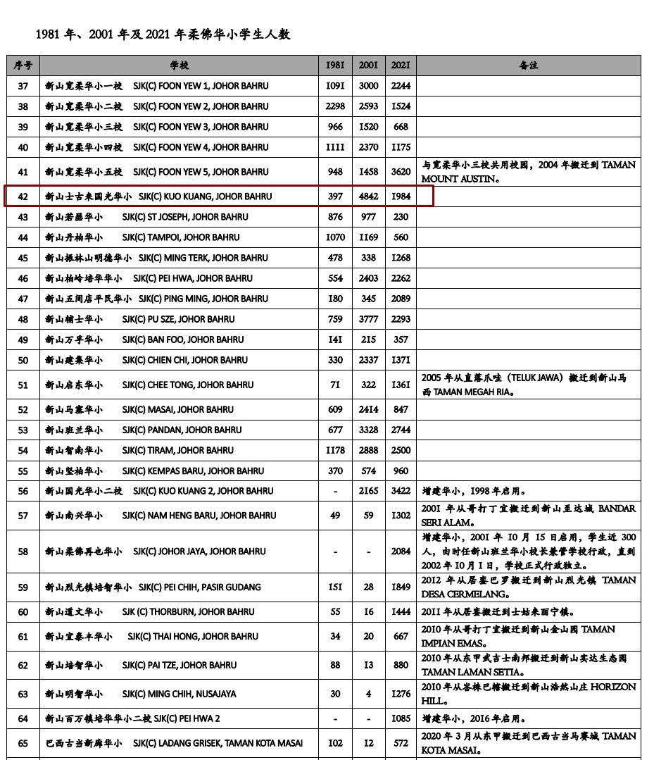 根据教总数据,国光学校在1981年学生人数397人,2001年飙升至4842人,直到2021年减至1984人。