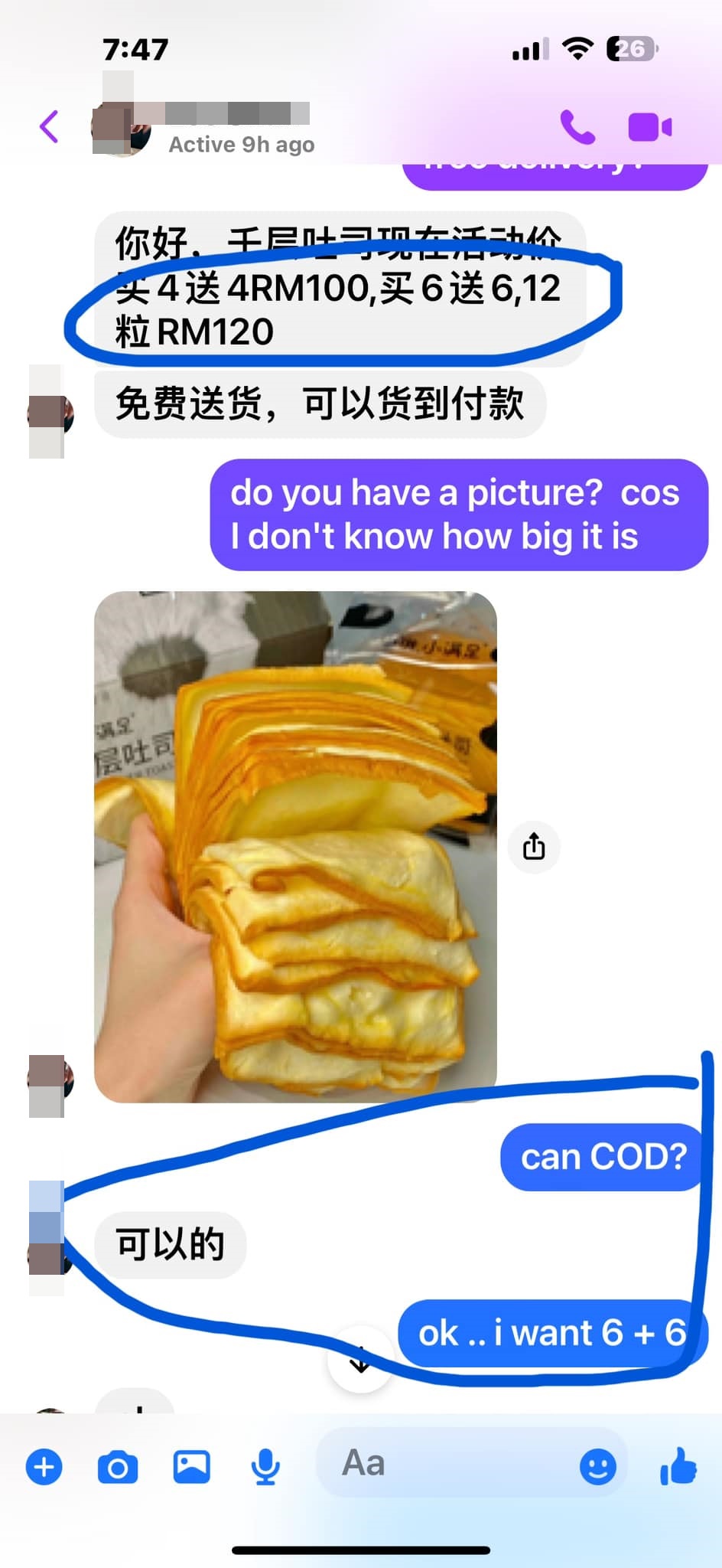 一名老千疑盗用他人照片,在网上代购马六甲爆红的手撕面包,并打出买6粒送6粒的优惠噱头,要价120令吉。
