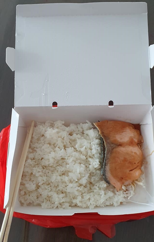 前日(24日)一名网民在“COMPLAINT SINGAPORE”上载贴文,展示在榜鹅一美食广场摊位打包的三文鱼照烧饭(Salmon Teri Rice),结果只有白饭和一块薄鱼肉。