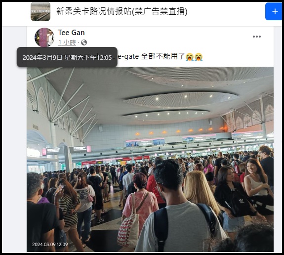今日关卡依旧人挤人,而且大排长龙,网民Zoe Tung在面子书指出:“刚刚11:30am我抵达入境马来西亚的关卡时,全部E-Gate都呈现红色显示故障了。”