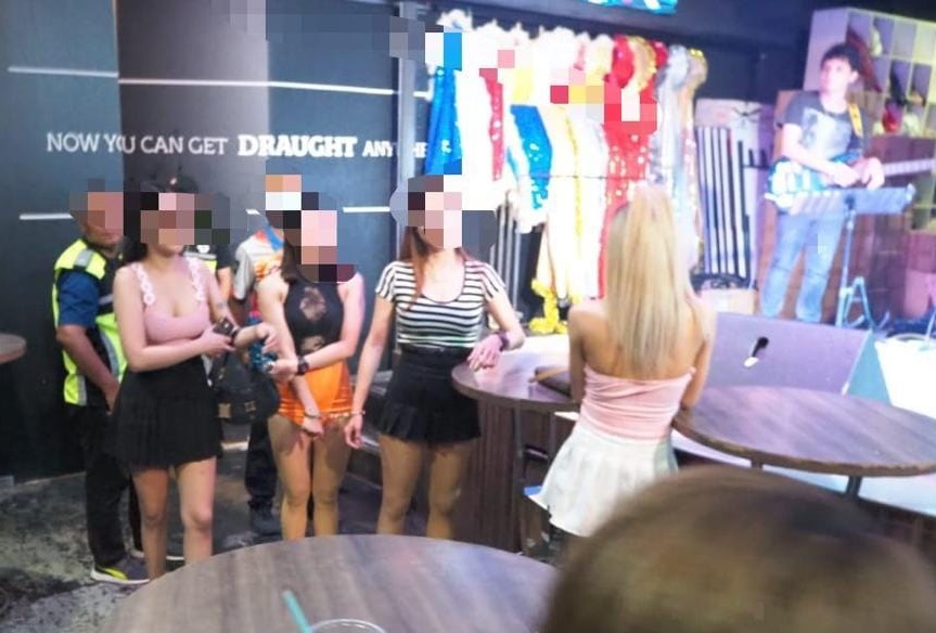 该“吊花场”夜店以泰妹居多,穿着性感火辣,当执法人员出现时,有的企图躲进厕所,但依旧狼狈被捕。