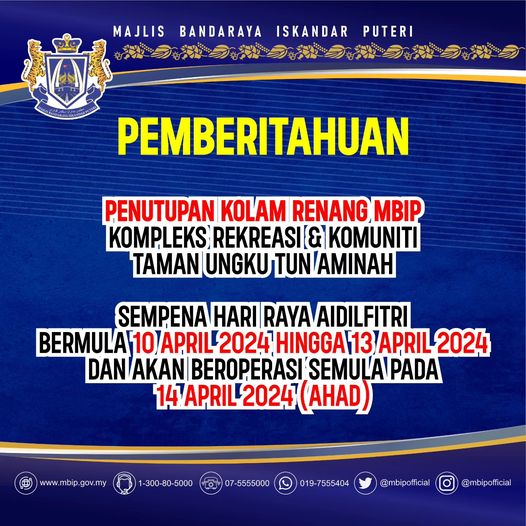 依斯干达公主城市政局(MBIP)今日发出通告,休闲及社区综合大厦内的游泳池,从4月10日起关闭至13日。