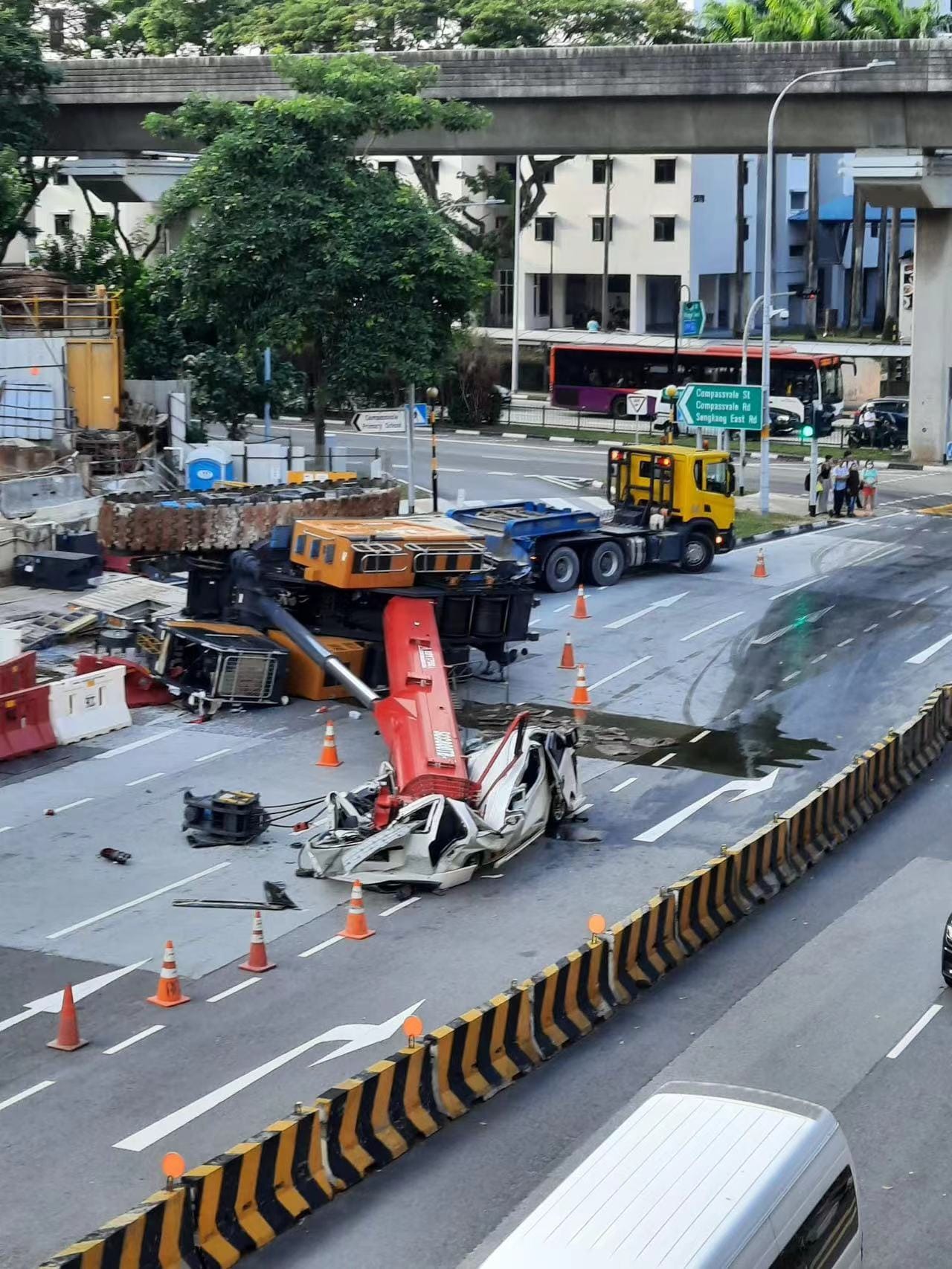 (新加坡9日讯)骇人意外!盛港工地一架起重机倒下,砸中路过的客货车,司机受伤送院检查治疗。