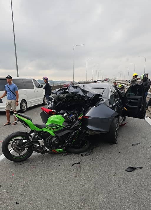 (新山、新加坡20日讯)马新第二通道一早发生恐怖车祸,一辆骑士撞上因事故停在车道的轿车,以致猛里轿车尾部,现场重伤毙命。