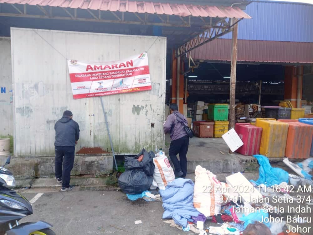 张孳璘在面子书发文指出,Setia Indah 巴刹垃圾桶置放地点即使清理了一遍又一遍,甚至挂上了“不许丢垃圾的告示布条,每天早上依旧有垃圾出现在地上,造成南方环保有限公司(SWM)必须额外安排清理。