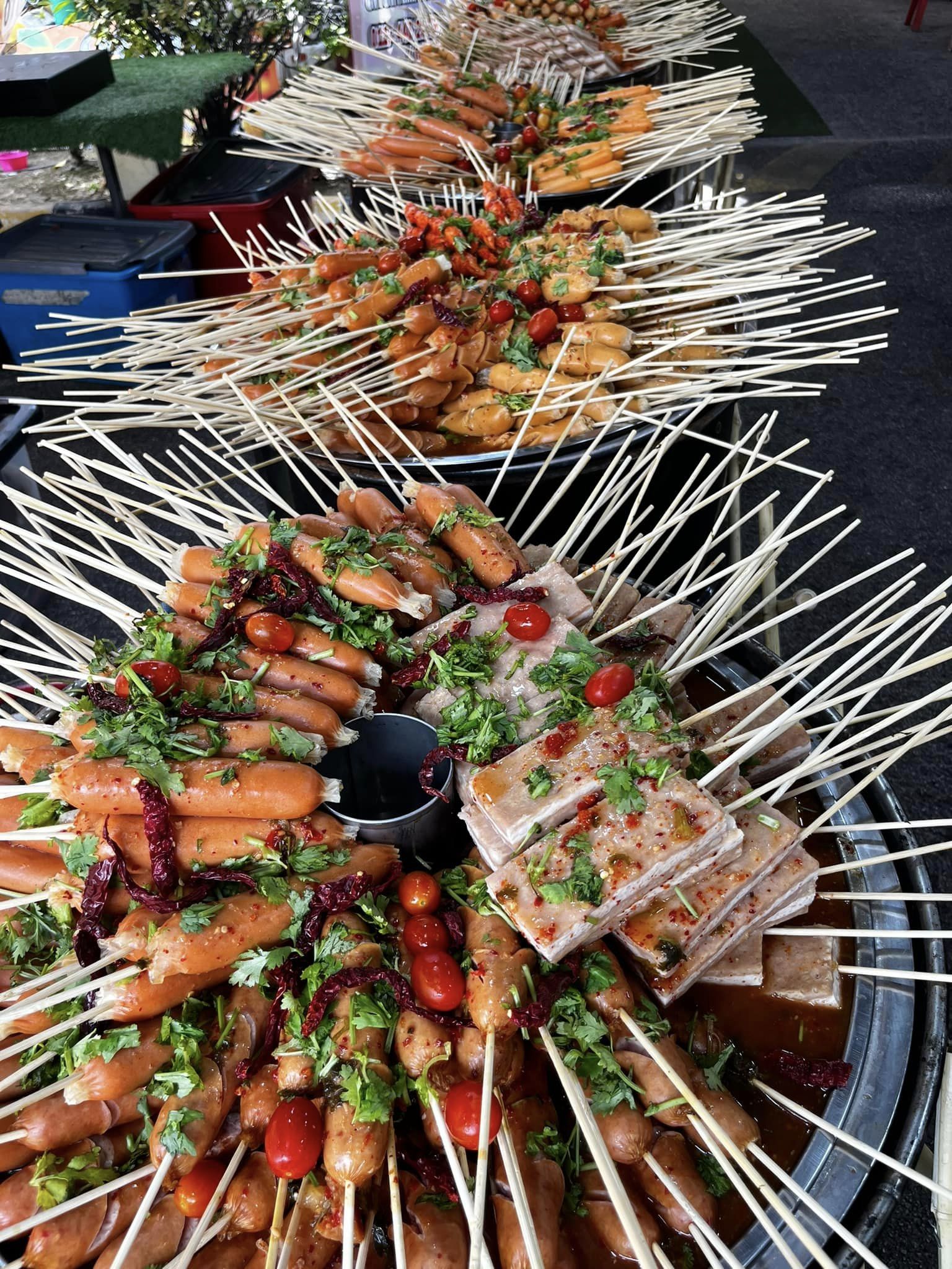 泰国汉堡、蛋饼、凤爪、泰国串串、泰国丹诺面、泰式青木瓜沙拉、东炎、小螃蟹、泰式鸡饭、芒果糯米饭,各种小吃和腌水果等。