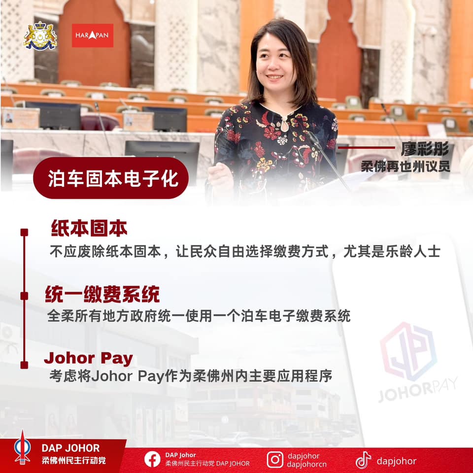 日前柔佛第15届立法议会第三季第一期会议,民主行动党柔佛再也州议员廖彩彤提出,全柔所有地方政府应统一使用一个泊车电子缴费系统。