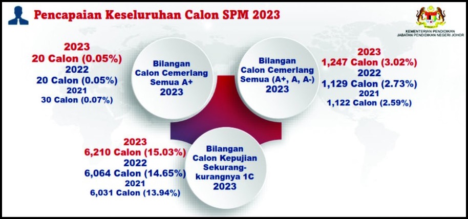 2023年全柔考生有4万2221人,出席者有4万1320人 ,93.8%即3万8760名考生获得SPM文凭。这成绩比2021年的87.50%、2022年的91.54%都得高。