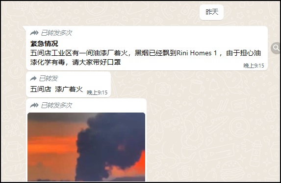 目前周边地区居民担心,火患造成有害化学物质污染空气,并呼吁戴口罩,这也有待当局化验调查。