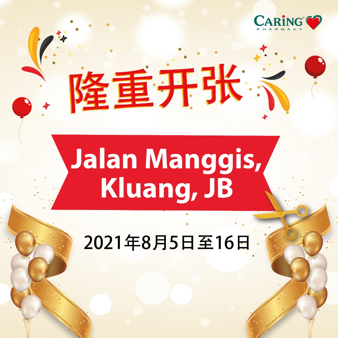 (新山9日讯)CARiNG Pharmacy 康宁药剂居銮(Jalan Manggis)分行,本月举行国庆和开张双庆,各种优惠等着您领取,现在就让CARiNG 成为您的健康良伴。