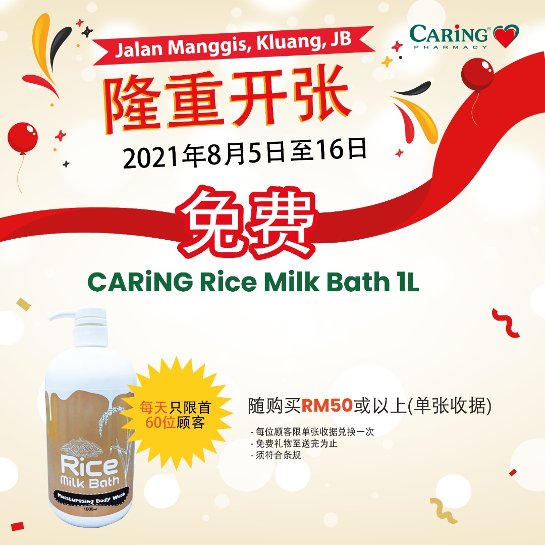 即日起至16日,凡购买50令吉或以上者(凭单张收据), 就能免费获得CARiNG Rice Milk Bath 1公升。