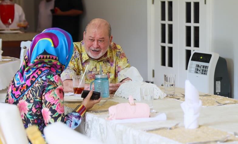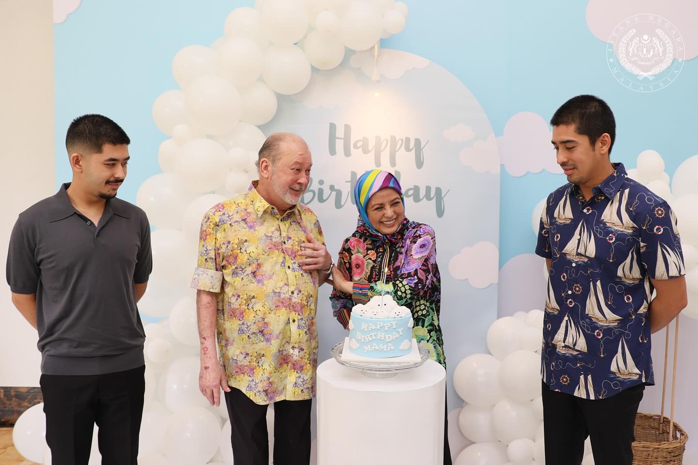 四王子东姑阿都拉曼、五王子东姑阿布峇卡陪伴在恻。国家元首苏丹依布拉欣穿上亮丽上衣,陪爱妻庆生,更逗得元首后开怀大笑。