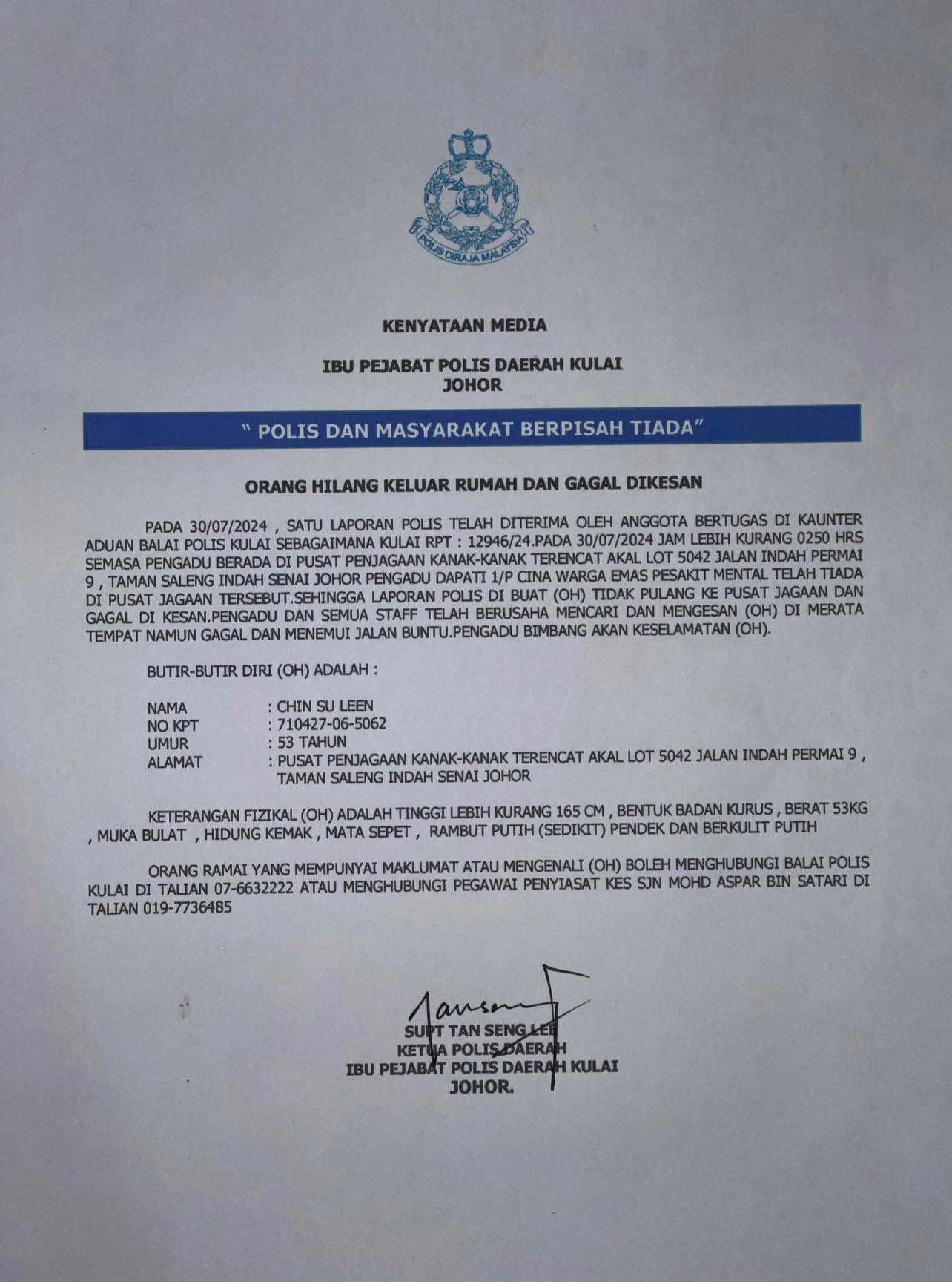 看见Chin Su Leen的民众,可致电古来警区: 07-6632222 或查案官Mohd Aspar 019-7736485。