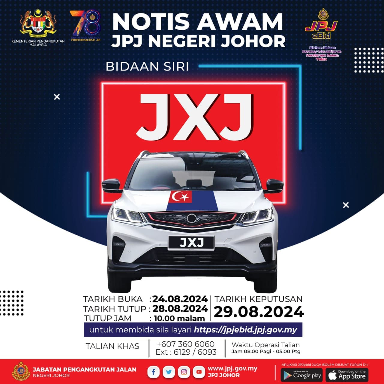 有兴趣竞标“JXJ”任何车牌号码的车主或公司,可通过竞标官网 https://jpjebid.jpj.gov.my或手机应用程式竞标。