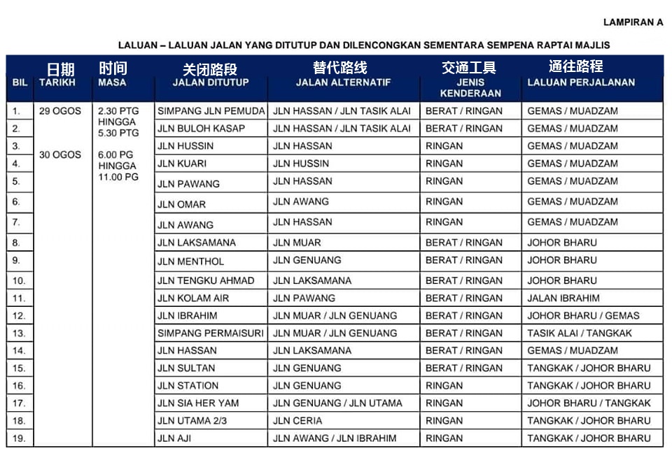 (昔加末25日讯)配合柔佛州级国庆日庆典和游行,昔加末于8月29日至31日将进行封路。
