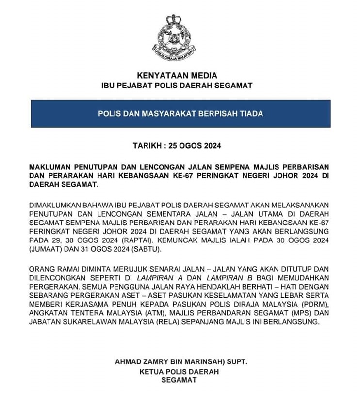 昔加末警区主任Ahmad Zamry今日发布“封路、改道”通告,以进行第67届柔佛州级国庆检阅及昔加末区游行,并提醒民众绕路而行。