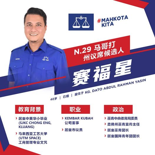 国阵马哥打州议席补选候选人Syed Hussein 为自己取的中文名“赛福兴”,现在更改为“赛福星”,希望福星高照带来好运,顺利当选为民服务。