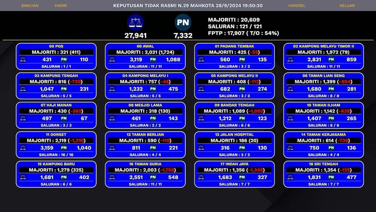 2022年,希国和希盟得票总计2万8056票。此次补选,国阵与希盟合则拿下2万7995票。投票率在55%左右。