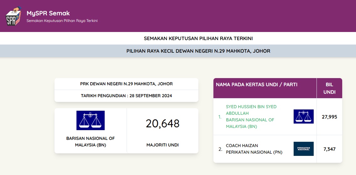 根据选举委员会今晚9时许,官方发布的成绩,国阵候选人赛福星的多数票2万0648张。
