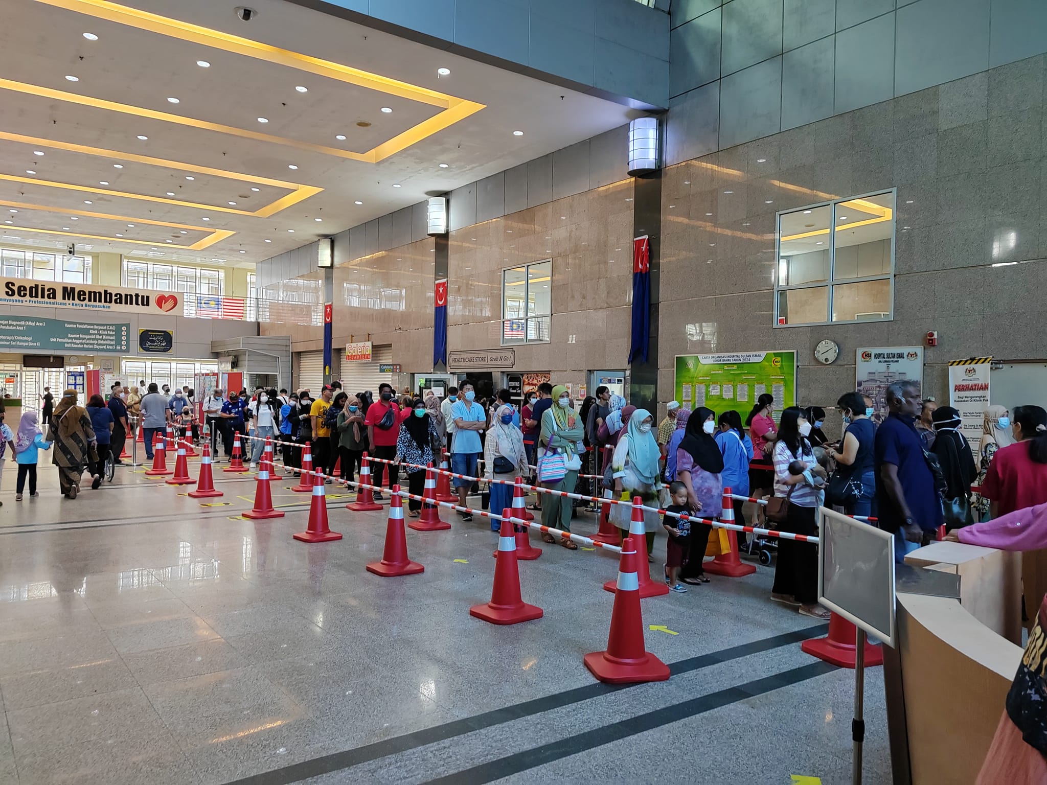 新山班兰医院发出文告,可见主楼大堂处,已用路锥排列好列队通道,让前往专科诊所挂号看诊的民众,更系统、更规律地排队,减少插队问题。