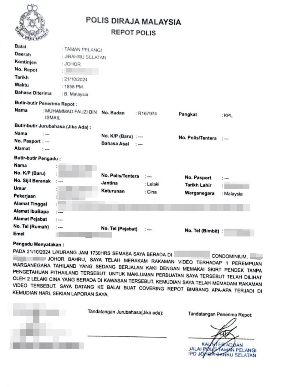 闹得沸沸扬扬的偷拍裙底风光事件,新山南警区副主任林日辉今日发文告指出,警方今早8时得知社交媒体流传相关视频,经调查后,事件在新山Wadihana路的一栋公寓发生。