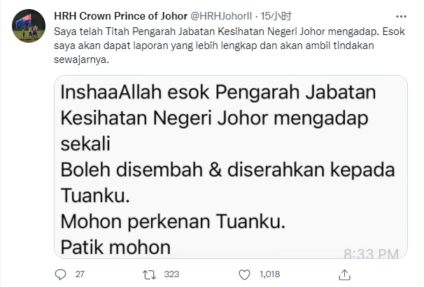王储在推特回覆网民,柔佛卫生局主任将呈最初报告给他,以进一步了解班兰医院情况。