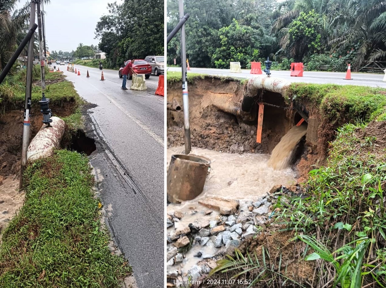 (新山8日讯)车在路面走,水在地下流!双溪地南甘榜道路崩塌,触目惊心,唯承包商已封路修补。