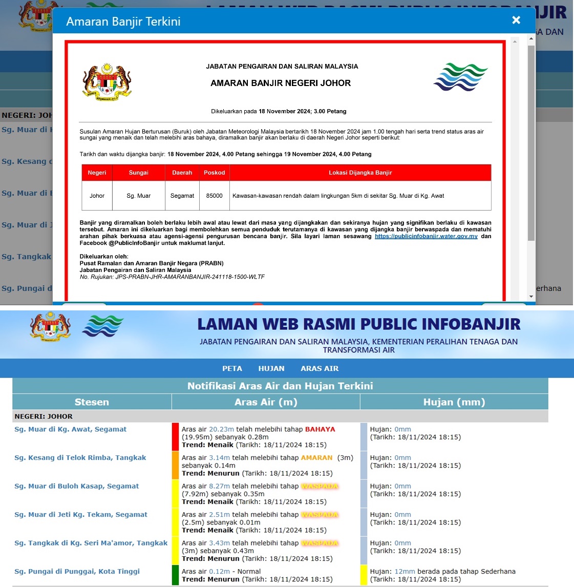另外,水灾公共信息官方网站显示,昔加末县位于Kg Awat的麻坡河处于红色危险水位。