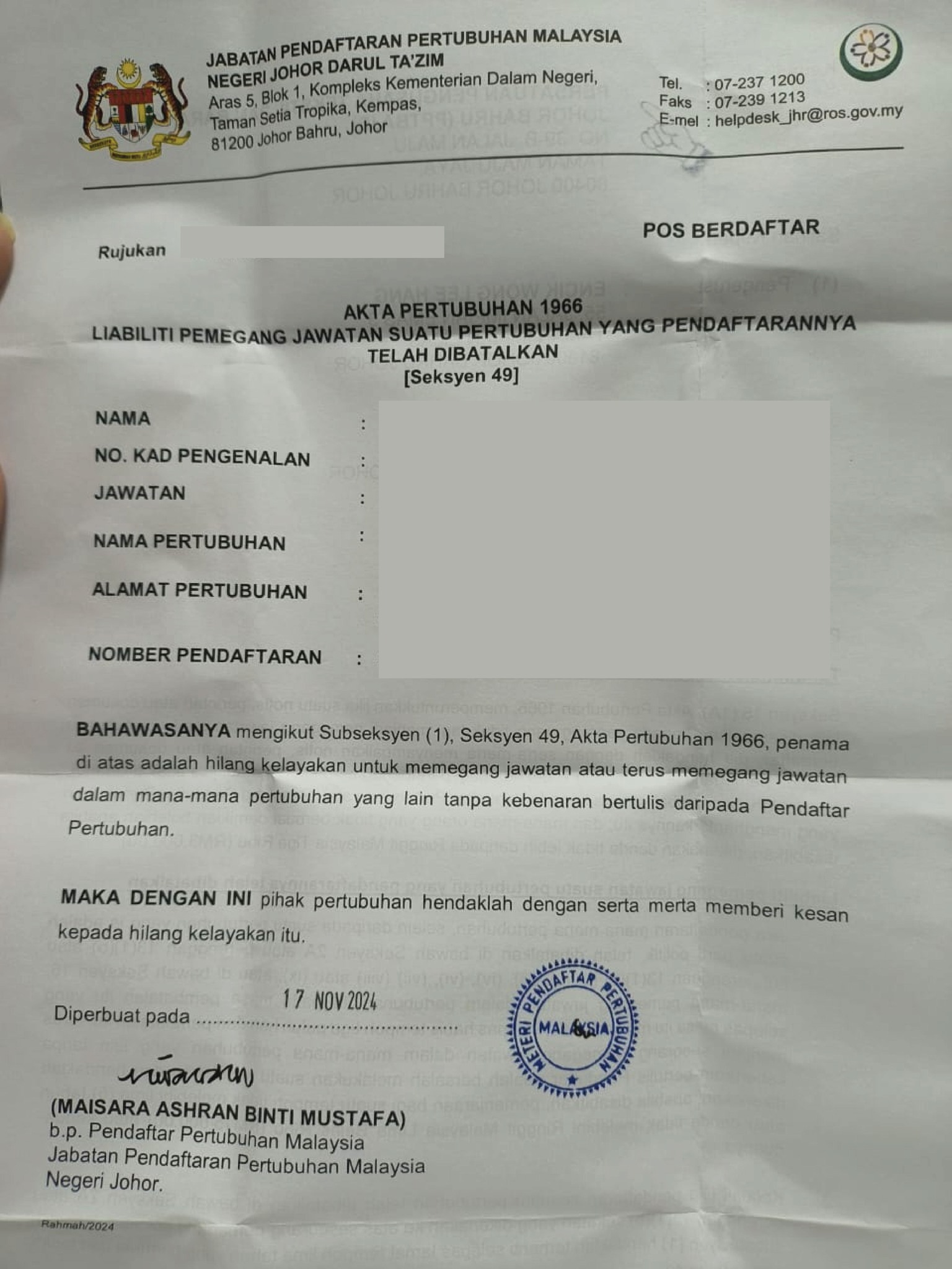 (新山5日讯)许多社团接社团注册局通知,指理事被列入了黑名单,禁止参与任何组织的理事会,影响社团正常运作。