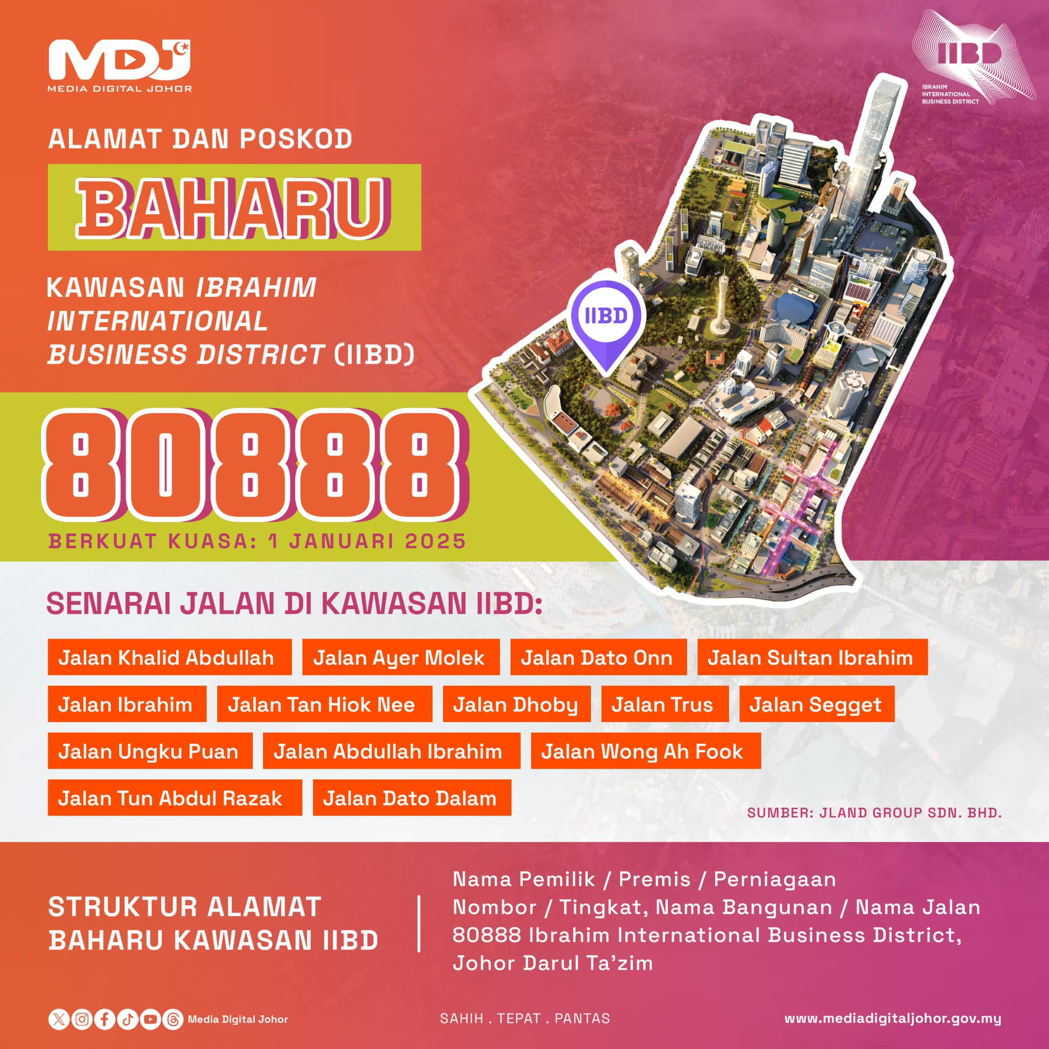 新山市政局(MBJB)通告指出,经国家元首苏丹依布拉欣同意,依布拉欣国际商务区(IIBD)地区将从2025年开始使用邮政编码“80888”。