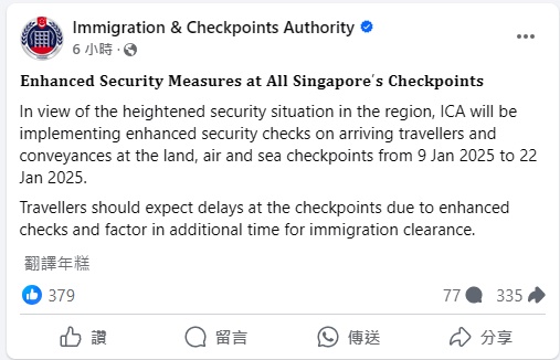 当局于今日发通告,指有鉴于该地区安全局势加剧,2025年1月9日至2025年1月22日,陆地、航空和海上关卡检查站,都会对抵达旅客和交通工具,实施加强安全检查。