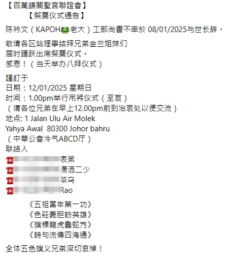 其中“百万镇关圣宫联谊会”的祭奠仪式通告,称呼死者为陈衿文“KAPOH老大(青蛙老大),并是联谊会的“工部尚书”。