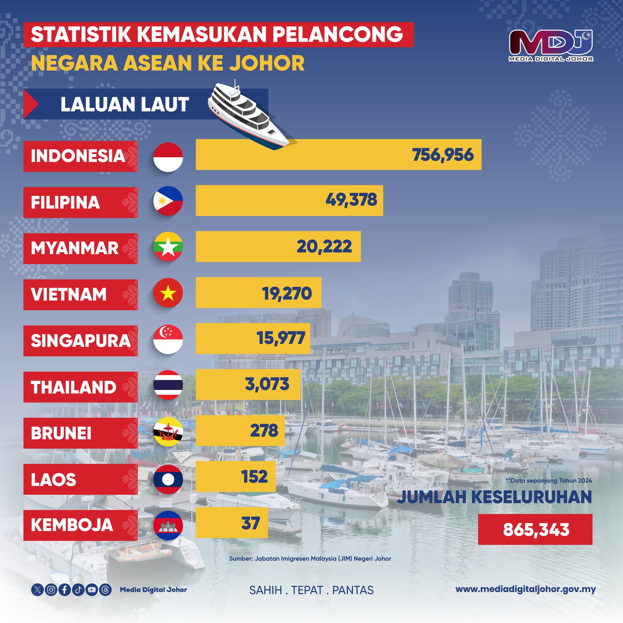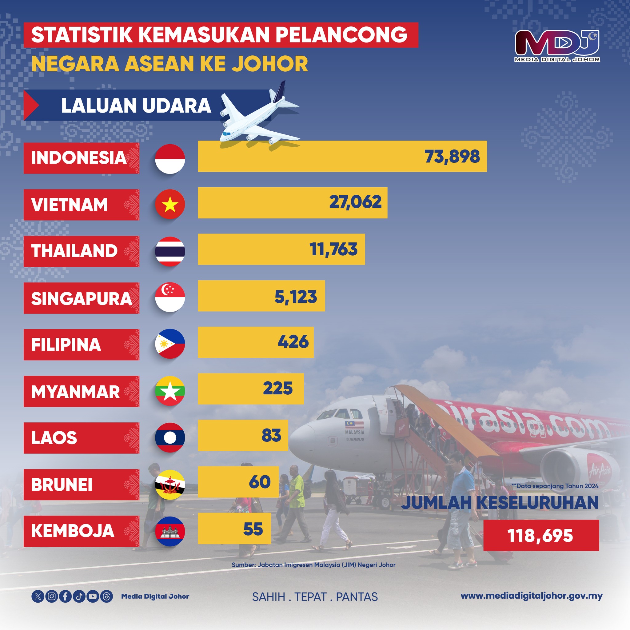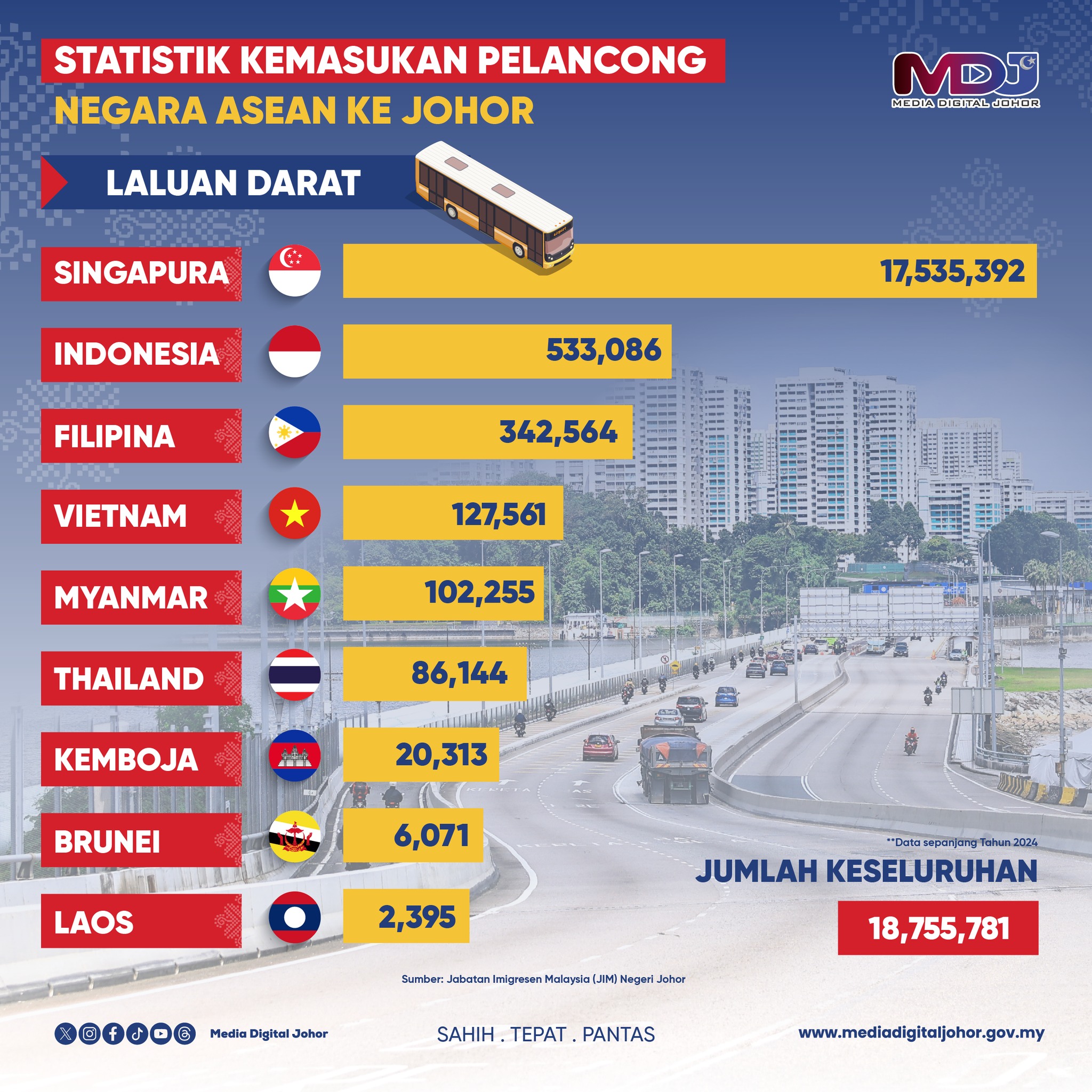 《柔佛数码媒体》(Media Digital Johor)报导,柔佛有大量来自东盟国家的游客,2024年全年通过陆海空航线抵达柔佛的游客,总数1973万9819人次。