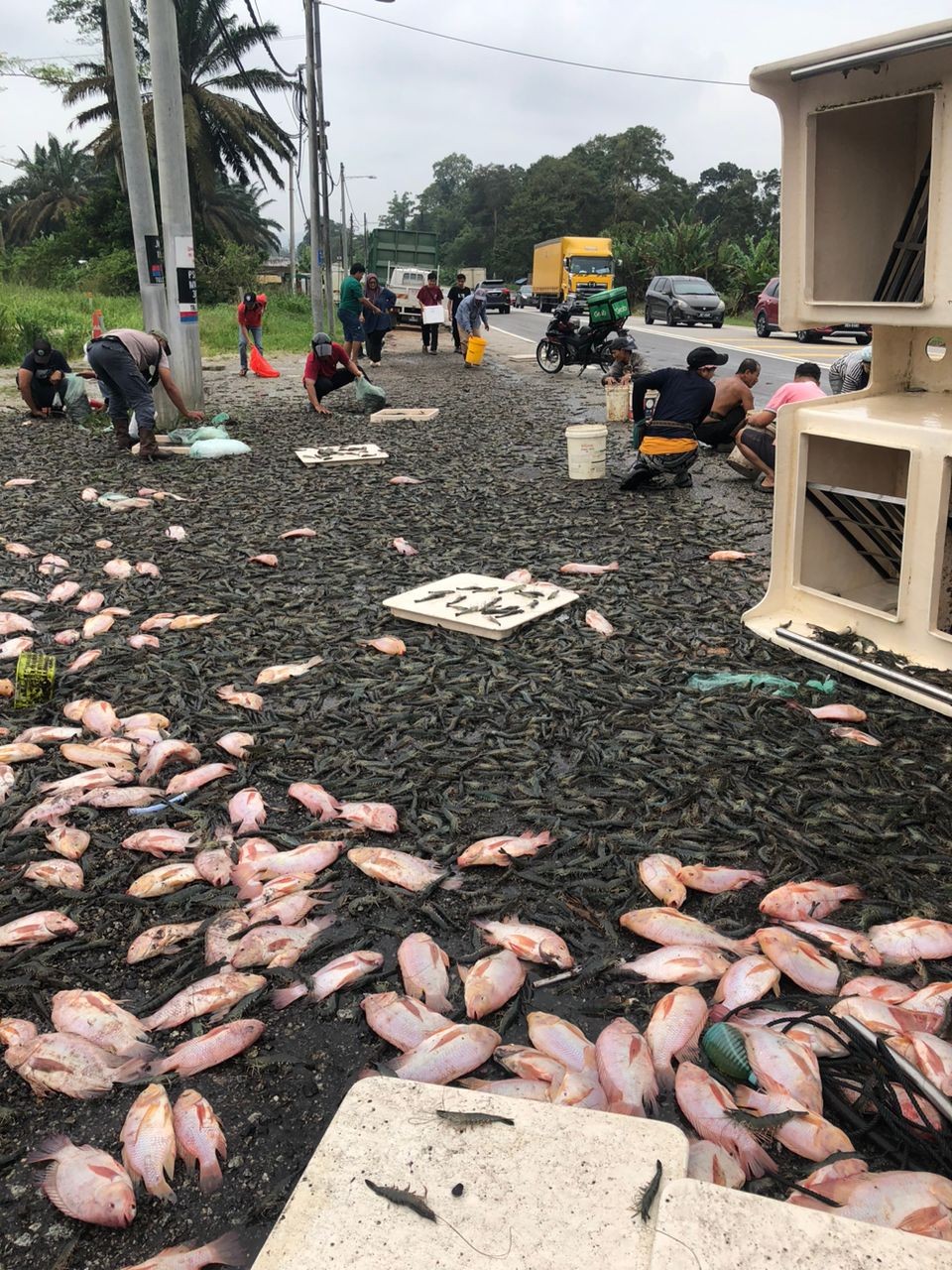 (哥打丁宜23日讯)罗厘翻覆,载送的鱼虾撒落一地,引来不少民众在路边捡鱼虾,又省下一餐。